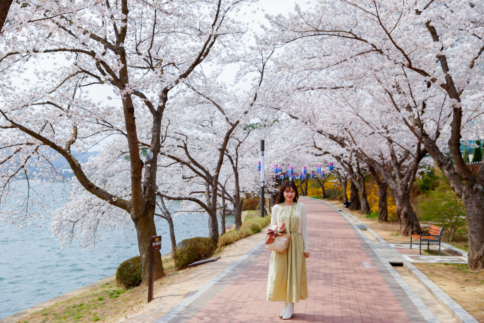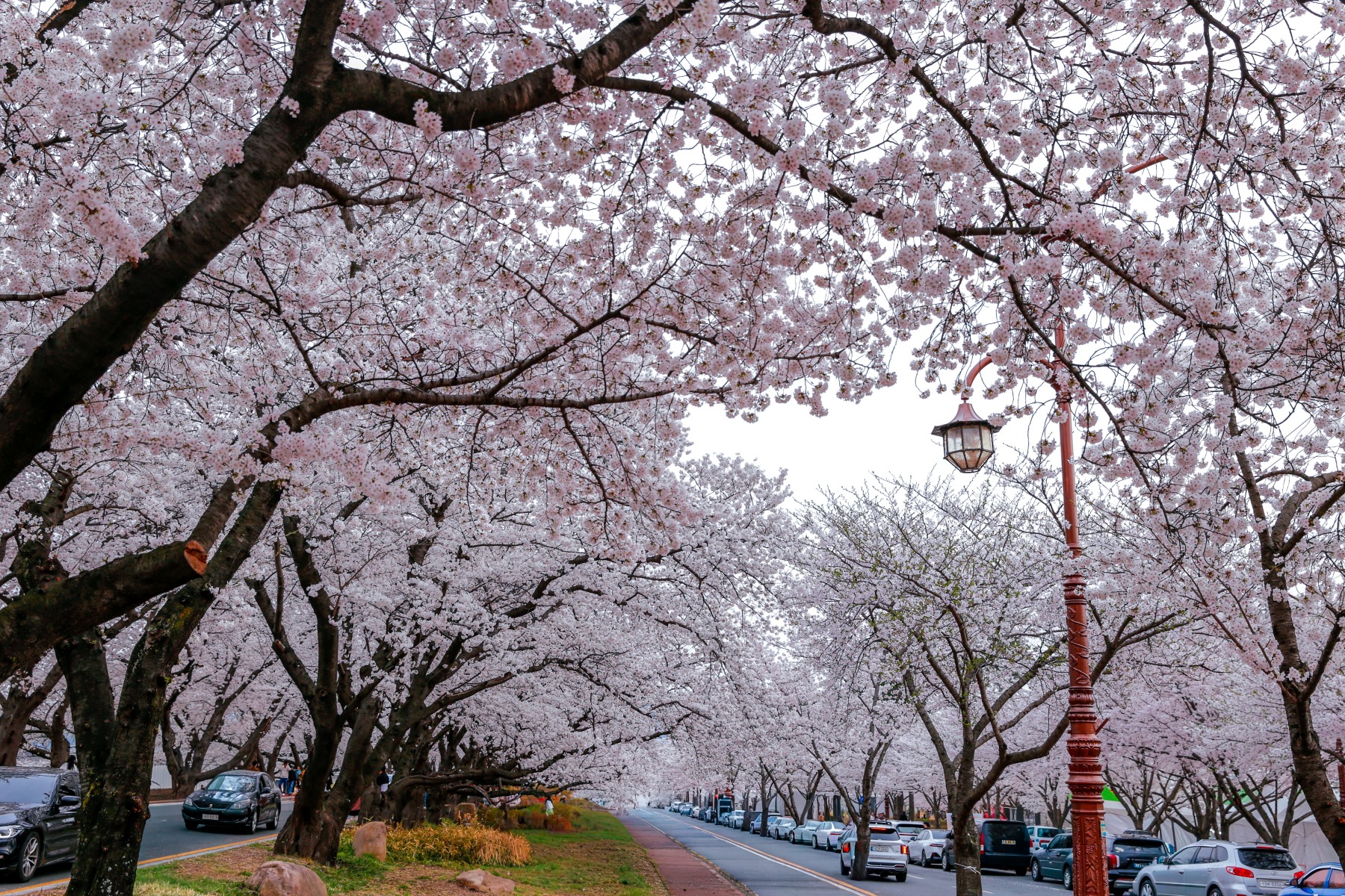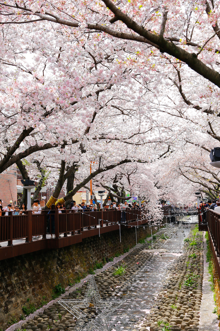 Nếu search trên google về mùa hoa anh đào ở Hàn Quốc, có lẽ những bức ảnh về suối Yeojwacheon sẽ xuất hiện ở vị trí đầu tiên, đủ để hiểu nơi này nổi tiếng đến thế nào. Suối Yeojwacheon là một con đường dài khoảng 1,5km từ trung tâm thành phố đến Trường Nữ sinh Jinhae, nổi bật với hai bên bờ được phủ kín các cây hoa anh đào. Nếu nhìn từ góc chính giữa, bạn sẽ có cảm giác như đang ngắm nhìn một đường hầm hoa huyền ảo.