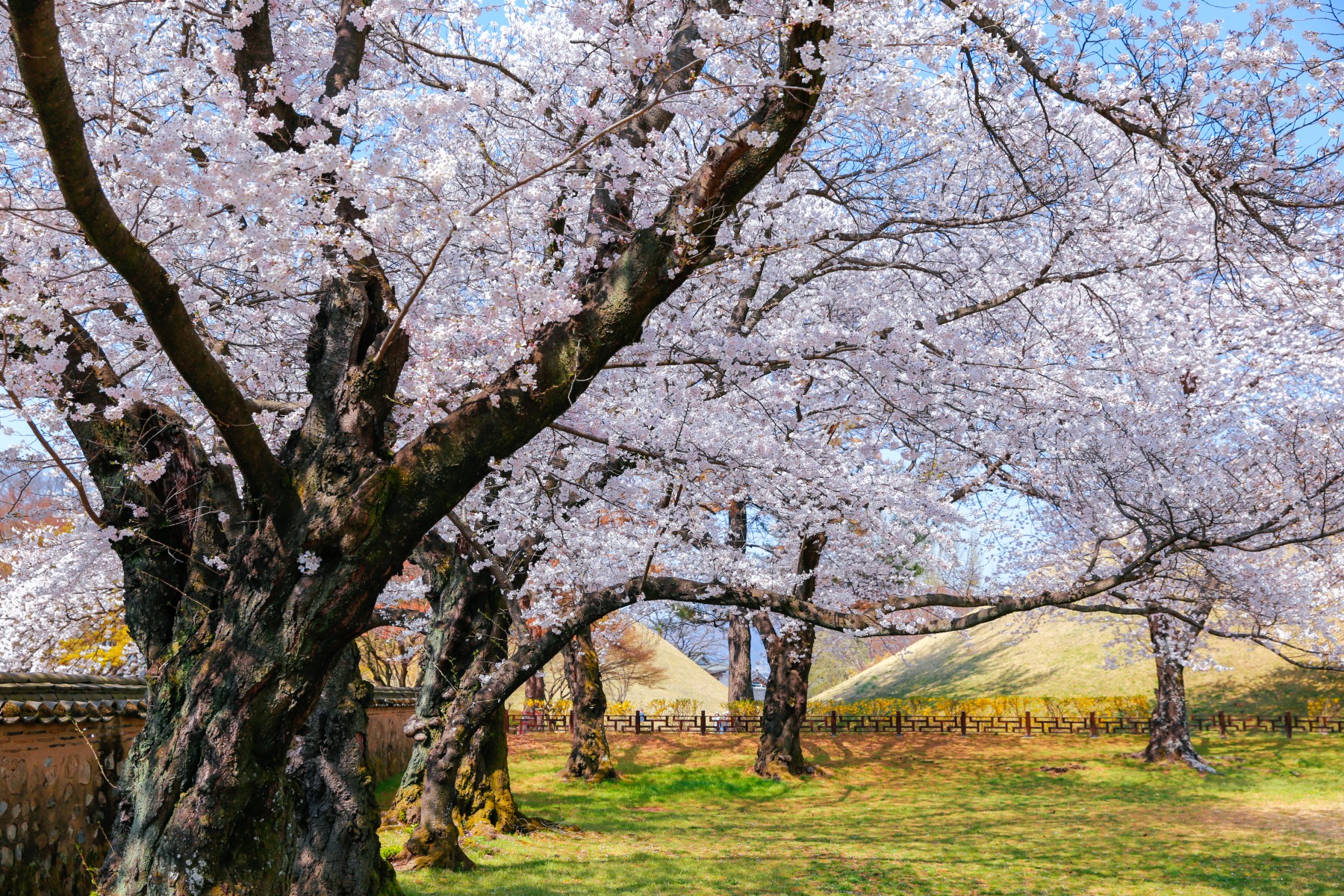 Bên trong những lăng mộ cổ tại Gyeongju là những cây hoa anh đào thuộc hàng cổ thụ lâu năm nên tán hoa rất dày và rộng