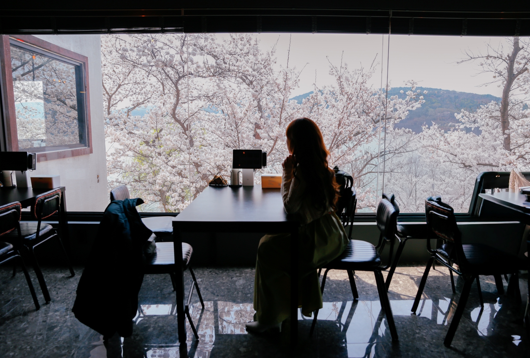 Mùa hoa anh đào ngồi vu vơ ở bất kỳ quán nào có cửa sổ lớn cũng đều được trải nghiệm tầm view mãn nhãn như thế này