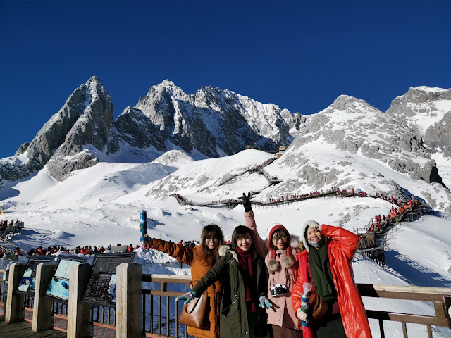 Đi từ xa đã nhìn thấy hình dáng của Ngọc Long Tuyết Sơn, sừng sững kỳ vĩ dưới nền trời xanh ngắt. Đỉnh núi trắng xoá đẹp đến mỹ lệ, nhiều góc nhìn thơ mộng không khác gì núi Phú Sĩ. Chính vì vậy mà cả chuyến đi, chị em đã quyết định gọi Ngọc Long Tuyết Sơn là Long-san, cho thân thương gần gũi như cách người Nhật gọi Phú Sĩ là Fuji-san.