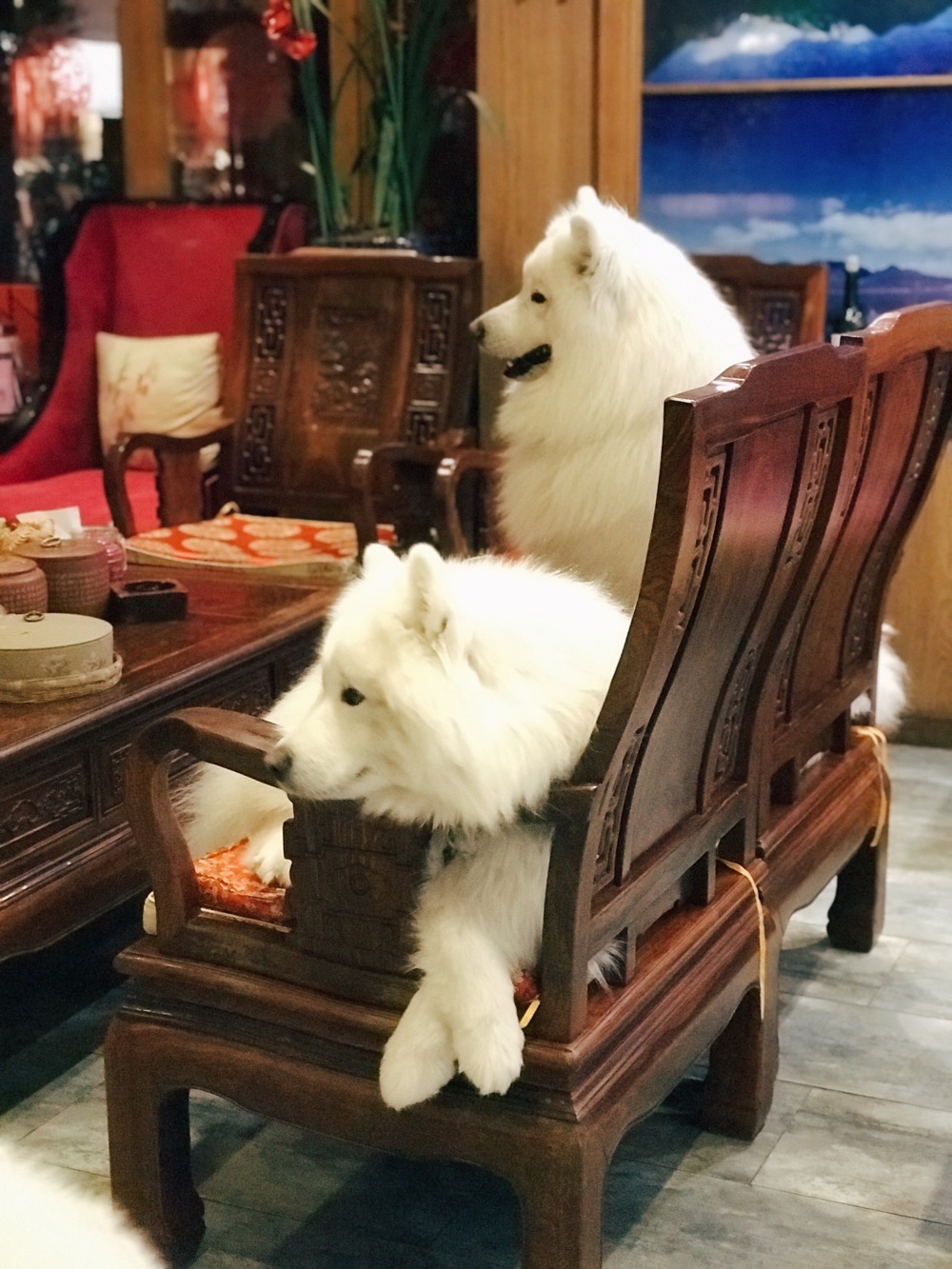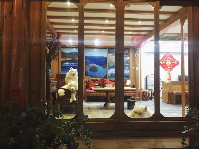 Nói thêm một điều là Đại Nghiên cổ trấn đúng là thiên đường dành cho những người yêu chó, vì ở đây là xứ lạnh nên tập hợp rất nhiều các giống chó to lắm lông, từ Alaska, Husky đến Golden, chó nào cũng đẹp cũng sang cũng quyền quý =))) Ngay ở hotel của Kịt cũng có một em Alaska cái tên là Ni Ni, to bự phải gấp 2 lần con Kịt, xinh đẹp kiều diễm thì thôi rồi. Có điều lúc này Ni Ni đang mang thai nên em hơi lãnh đạm với cuộc đời, không “hớn hở” nồng nhiệt đón khách được bằng chủ của em.