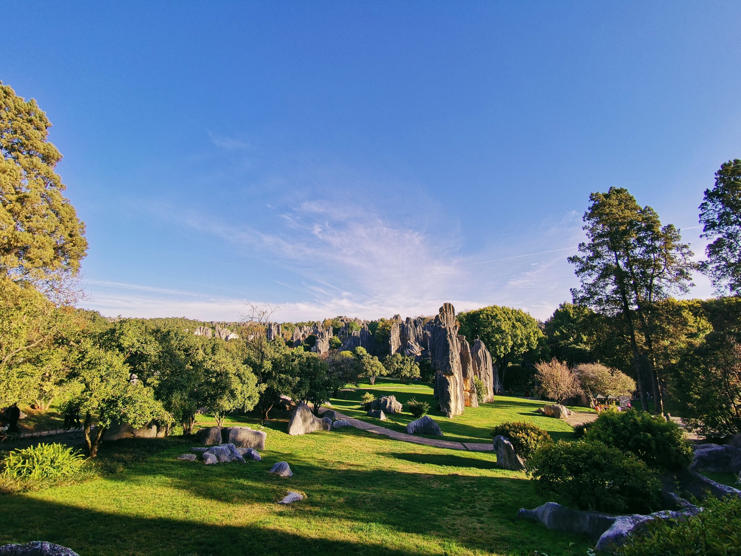 Ngoài những khối đá kỳ vĩ, Thạch Lâm còn ấn tượng ở những con đường với những hàng cây lớn và những thảm cỏ xanh mướt mát. Dạo bộ ở đây trong một ngày nắng đẹp cũng là một cách khiến con người thấy sảng khoái và thư thái hơn.