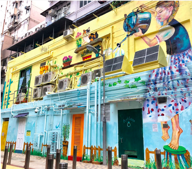 Cũng giống như khu phố cổ Georgetown ở thành phố Penang (Malaysia), Old Town Central ở Hong Kong là một tập hợp của vô số những tác phẩm nghệ thuật đường phố (Có vẻ mấy nước thuộc địa Anh rất chuộng style này). Những bức vẽ graffiti rực rỡ đã thổi hồn cho các bức tường trong từng ngõ nhỏ, trở thành điểm chụp ảnh check-in hàng đầu của du khách khi tới thăm Hong Kong. Dưới đây là hình ảnh và địa chỉ của những bức hoạ nổi bật nhất tại Old Town Central: 1/ Bức tranh những tòa nhà tập thể tong lau mang tính biểu tượng của Hồng Kông. Đây là một trong những bức hình được check-in chụp ảnh nhiều nhất ở khu Old Central Địa chỉ: Ngã tư của 46 Graham Street và 48 Hollywood Road, CentralNguồn ảnh: Từ cuốn “Old Town Central – Self-guide walk”