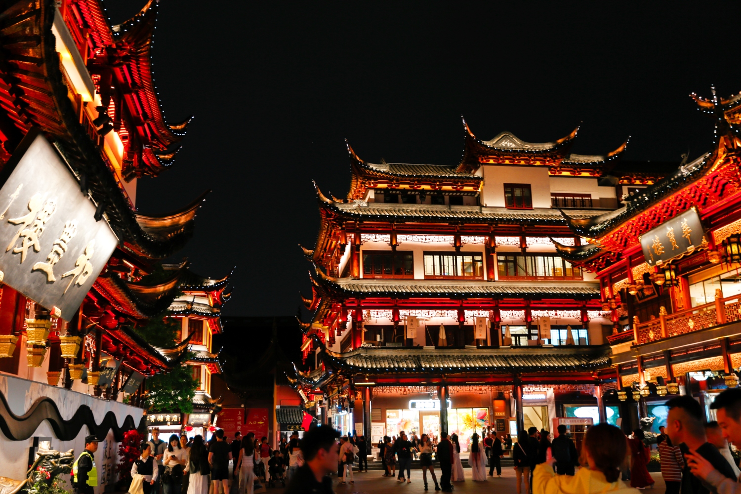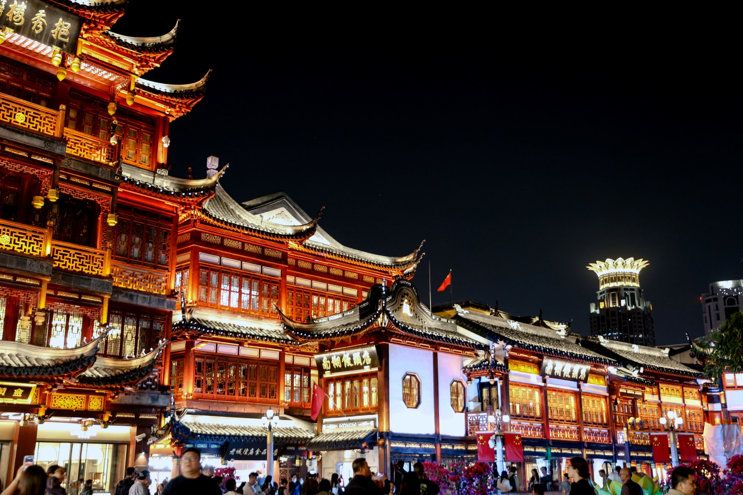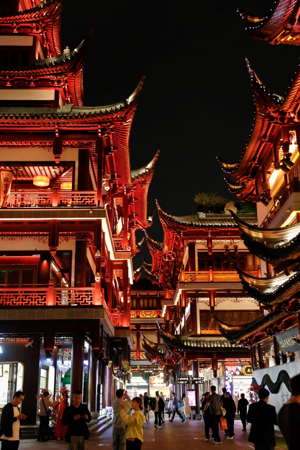 Toàn bộ khu vực không chỉ có ngôi miếu thờ Thành Hoàng – vị thần hộ mệnh của thành phố – mà còn là một tổ hợp phố đi bộ cổ, cửa hàng truyền thống, quầy ăn vặt và không gian kiến trúc lịch sử. Những mái ngói cong vút, đầu đao chạm khắc, hành lang gỗ đỏ uốn lượn, tất cả tạo nên một bức tranh sống động của Thượng Hải cổ.