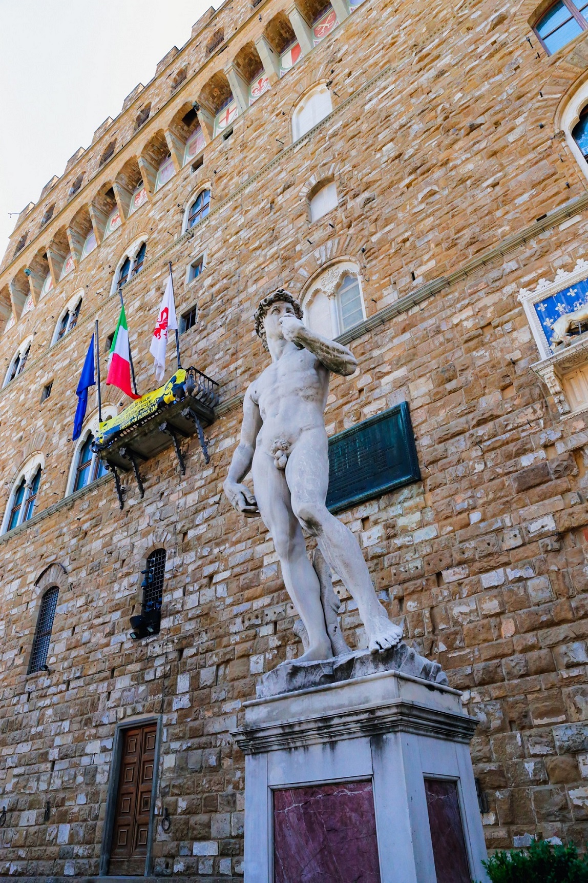 Ngay phía bên ngoài là đài phun nước Fountain of Neptune và một phiên bản của tượng David nổi tiếng (bản chính đang được bảo quản tại bảo tàng Galleria dell’Accademia cách đó tầm 1km). Dù chỉ là bản copy nhưng bà con du khách cũng nô nức xếp hàng chụp ảnh cùng anh David version “super fake” này, khiến lối vào Palazzo Vecchio thường xuyên trong tình trạng đông đúc, ùn tắc.