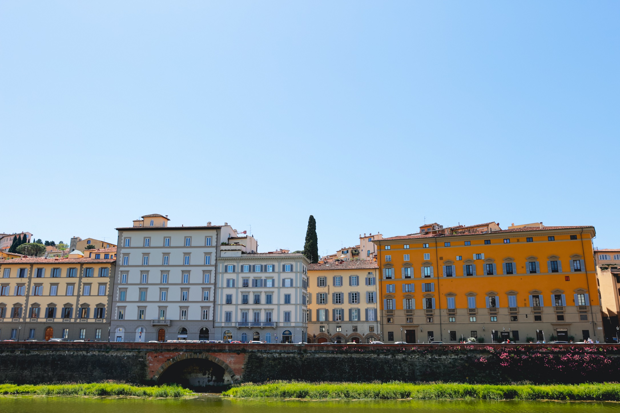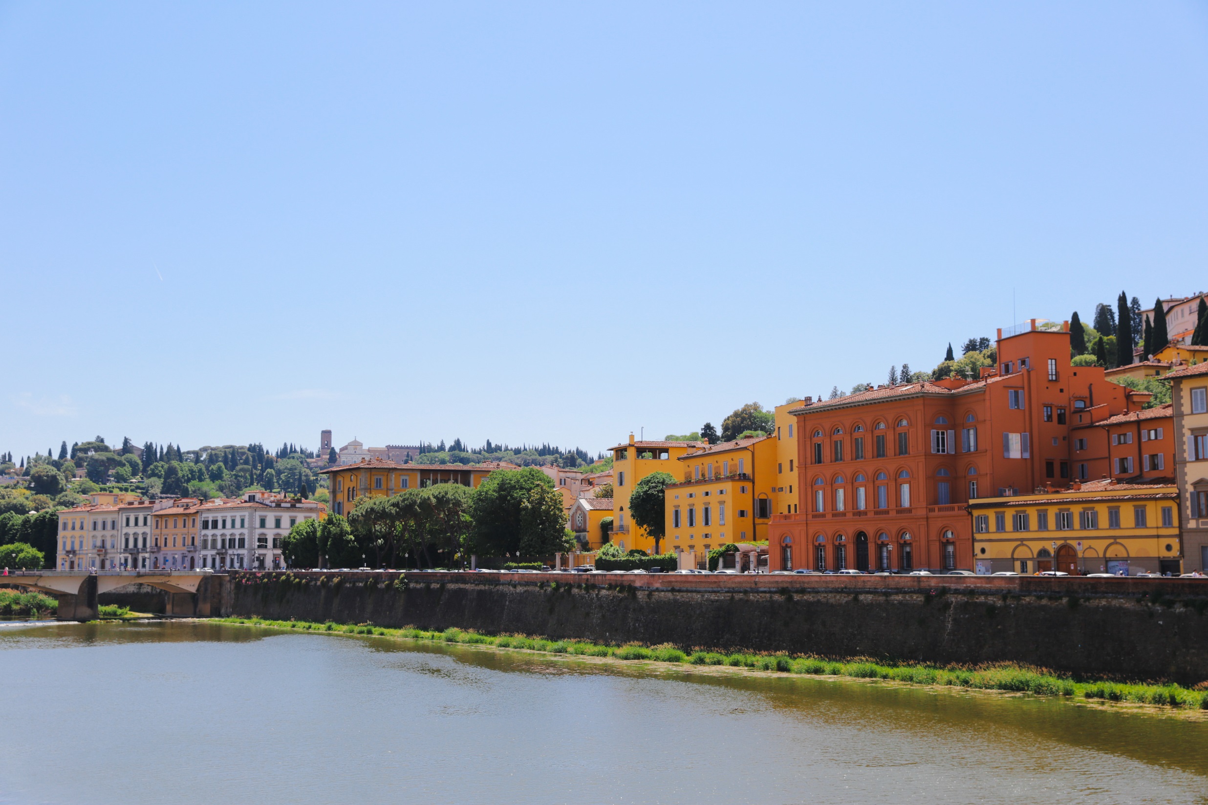 Từ Phòng trưng bày Uffizi Gallery, bạn chỉ cần đi vài bước chân là ra đến sông Arno, con sông huyết mạch chạy quanh thành phố. Từ vị trí này, Kịt có thể nhìn thấy những dãy nhà cổ được quy hoạch rất gọn gàng bên kia bờ, với đủ gam màu từ paste nhẹ nhàng đến tông vàng, da cam rực rỡ. Điểm nổi bật nhất ở khu vực này là chiếc cầu cũ mang tính biểu tượng của Florence – Ponte Vecchio (bản thân cái tên này cũng có nghĩa là “Cầu cũ” trong tiếng Ý).