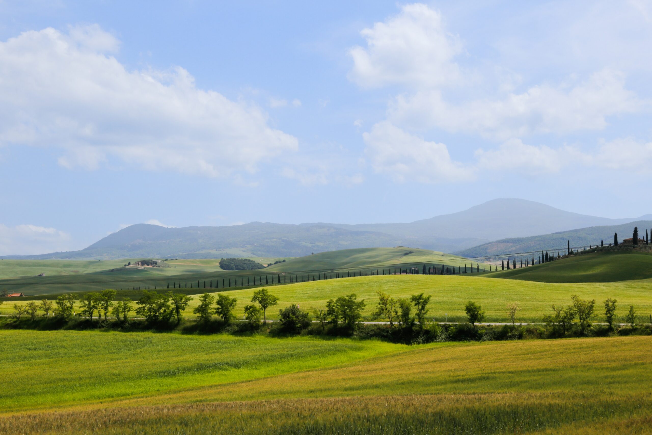 Đầu tiên là Cipressi di San Quirico d’Orcia, một địa điểm khá nổi tiếng ở Tuscany với một cụm cây cypress đơn độc giữa thảm cỏ xanh mướt. Lác đác trên cao còn có dăm ba chiếc cây cô đơn đứng lẻ loi giữa đất trời và thiên nhiên, nhìn đậm chất nhiếp ảnh.