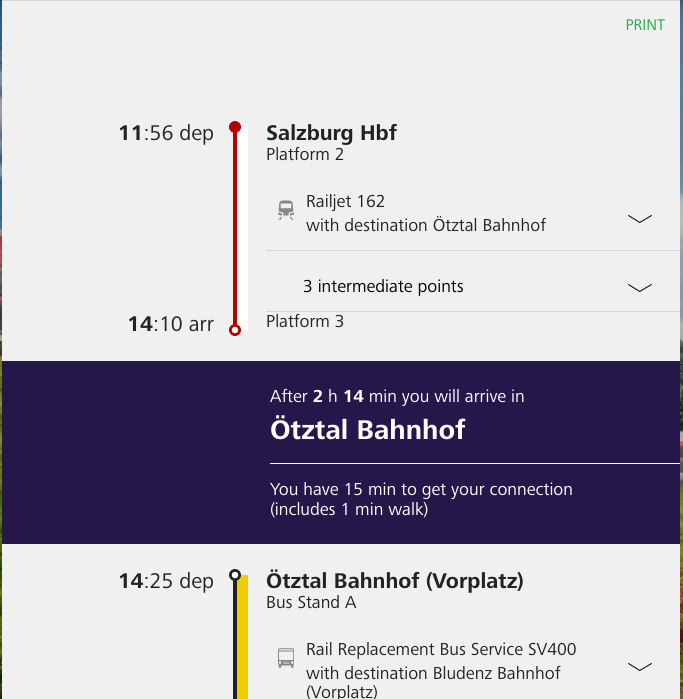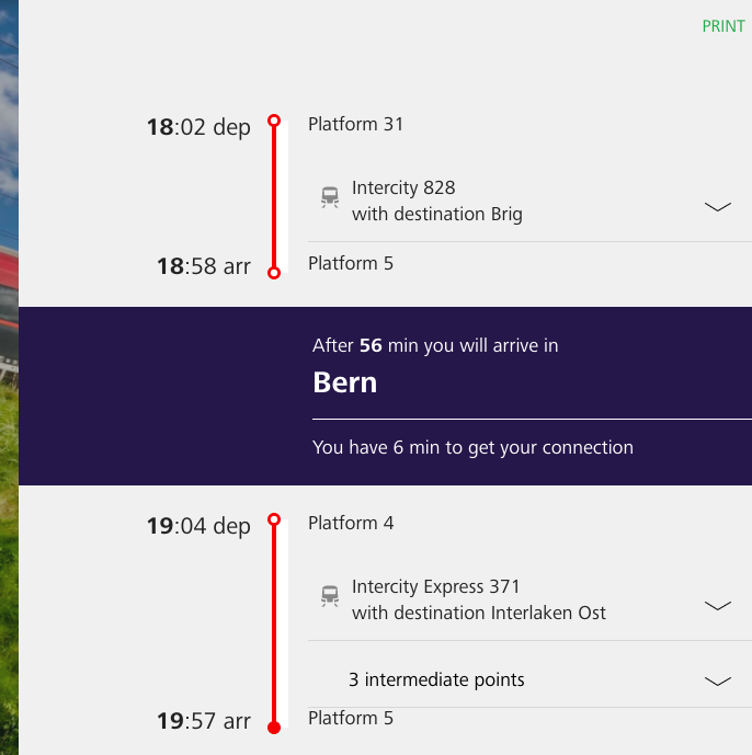 Ví dụ cụ thể như trường hợp của cháu bé Kịt: Trên chặng đi từ Salzburg (Áo) đến Interlaken (Thuỵ Sĩ) kéo dài đến gần 8 tiếng, cháu bé Kịt đã đổi 4 lần tàu + 1 lần bus. Khi đặt vé xong, Kịt theo chỉ dẫn của email để tới được hành trình chi tiết như dưới đây, trong đó có chặng tại Bern là mình chỉ có 6 phút để di chuyển từ Platform 5 đến Platform 4.