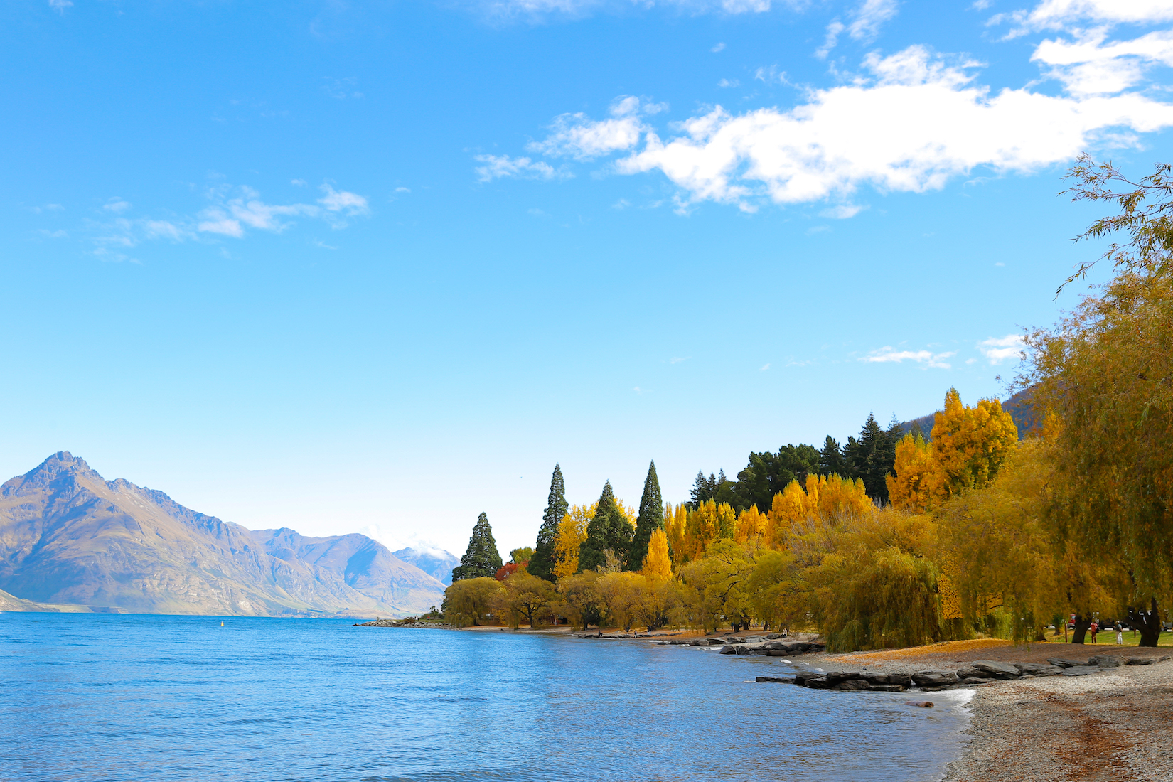 Hồ Wakatipu dài hơn 80km và cũng là hồ nước dài nhất tại đảo Nam, được tạo thành bởi các dòng chảy từ sông băng. Từ khu trung tâm, bạn chỉ cần đi bộ vài bước chân là ra đến hồ. Đi dạo bộ ở con đường ven hồ là một trong những trải nghiệm Kịt thích nhất. Càng đặc biệt hơn khi mình tới đây vào đúng thời điểm mùa thu, cỏ cây chuyển hết sang sắc vàng đỏ lãng mạn dịu dàng tới mức nao lòng.